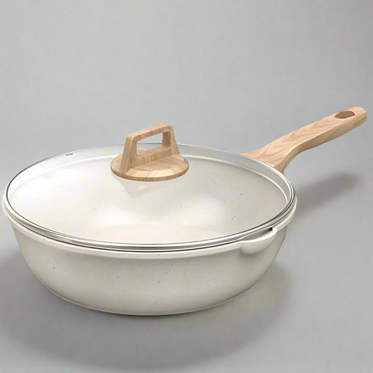 Our deep frying sauté pan combines a simply beautiful sleek design with everyday functionality. A light weight and durable construction makes for easy movability and a even easier clean! Featuring a tempered glass lid, a wooden handle for a cool grip and a convenient dual pouring mouth, this pan is an everyday essential for any chef!